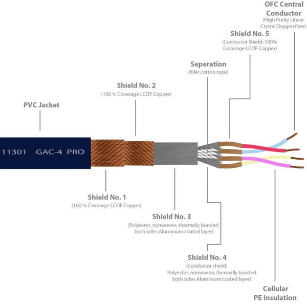 Kompromisslose Abschirmung! Mehr kann man nicht machen! Jeder Leiter (9) wird nach der Isolation mit einem Reussenschirm (100% abdeckende Kupferdrähte) geschirmt, darüber wird eine leitende Stoffschicht (Aluminiumbedampft) gelegt. 4 solcher Leiter werden dann mit Füllmaterial präzise sternmässig verseilt um eine hohe Flexibilität und beste Einstreudämpfung zu sichern. Dieser verseilte Strang wird dann wiederum mit einer leitenden Stoffschicht belegt um die Konstruktion zu sichern und die Impedanz zu fixieren.